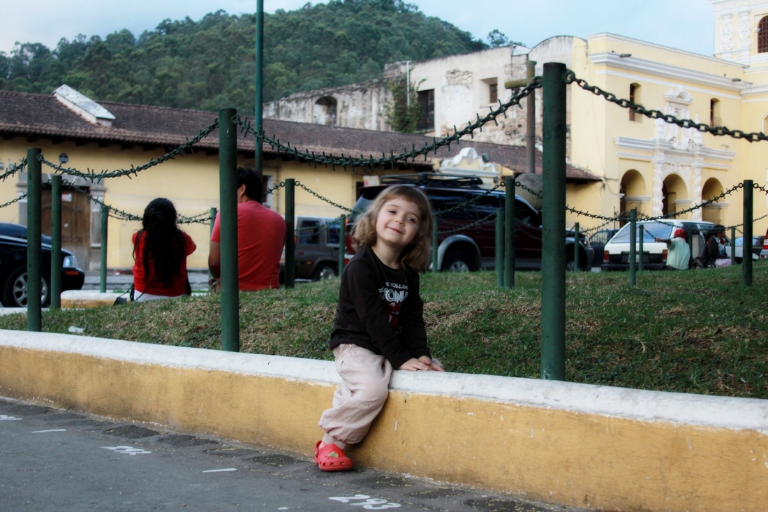 W Antigua uwielbiała dom Fernado i Evelyn, u których mieszkaliśmy. Zresztą nic dziwnego, my też go polubiliśmy. Patio, hamak, do tego pies i dwa koty (po raz kolejny polecam portal Airbnb). Sama Antigua nie zachwyca urokiem, ale to spokojne i bezpieczne miasto. Można tu przyjemnie poleniuchować po prostu włócząc się po ulicach, przesiadując na rynku lub pod katedrą, obserwując leniwe życie miejscowych mieszkańców. W weekendy robi się trochę tłoczno, mówią że w sezonie jest tak cały tydzień. Ale Marysia bardzo lubiła te godziny szczytu – było za kim poganiać, była też muzyka do potańczenia. W Antigua jest też kilka zrujnowanych kościołów do zwiedzania. Polecam ponadto odwiedzenie lokalnego bazaru oraz chicken busowego dworca tuż obok.