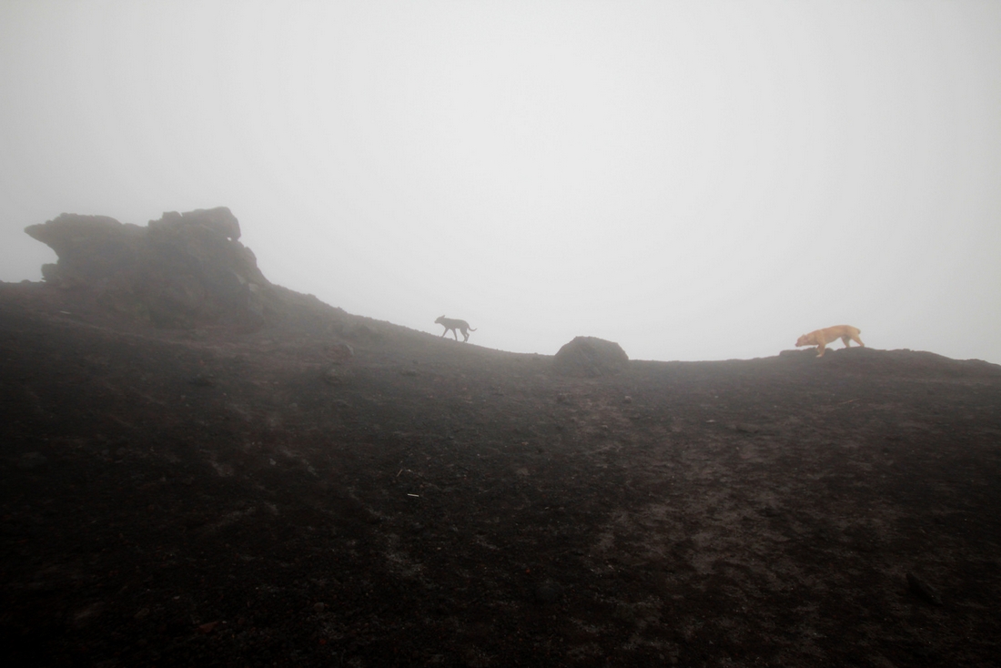 Mokro po nocnym deszczu, droga tonie w chmurach, zimno jak diabli, a do tego przenikliwy wiatr. Szczerze mówiąc mała przyjemność. No ale jak się przejechało 10 000 km… Wdrapałam się na szczyt, by w kłębach chmur podelektować się księżycowym krajobrazem. Marcin i Marysia zawrócili 10 minut wcześniej. Wiatr głowę urywał, a Marysia ledwo wykurowała się z przeziębienia.