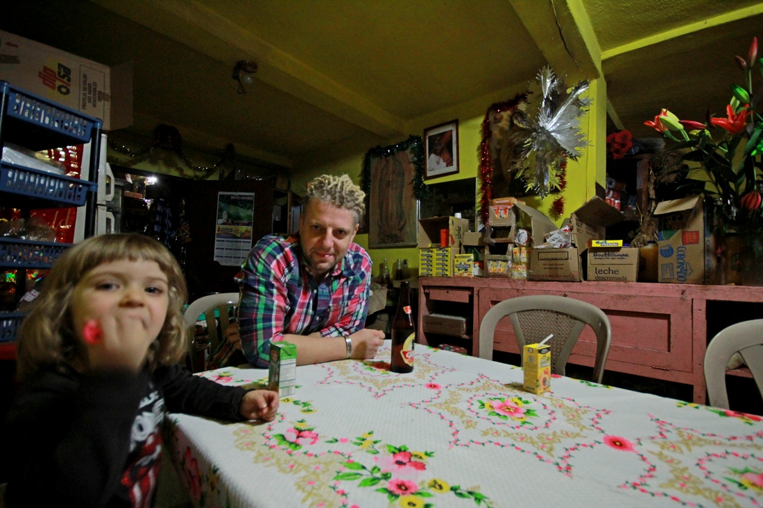 Wyjątkowym doświadczeniem była dla nas wizyta w sklepie La Canche. Dokładnie tak, w sklepie. Słyszeliśmy, że otwierają o 18.00 więc odczekaliśmy swoje, przysiadając na ulicy. Uznawszy, że już czas Marcin zaczął walić w drewniane drzwi. Otwarła je przykurczona babuleńka i machnęła ręką, by iść za nią. Poprowadziła nas na zaplecze swojego sklepiku. Ależ tam były cuda! Olbrzymia bożonarodzeniowa stajenka, figurki świętych, obrazy papieży (w tym Polaka, a jakże), ścienne malowidło z biblijną sceną, betlejemskie gwiazdy. A wszystko obwieszone migoczącymi choinkowymi światełkami. Marysia dostała oczopląsu, a „co to?” i „dla czemu?” nie schodziło z jej ust. Pomiędzy tymi cudami półki i skrzynie pełne sklepowych towarów. Gdzieś bardziej w głębi… kuchnia. Zasiedliśmy przy stole okrytym kolorową ceratą i zamówiliśmy danie. Specjalnością lokalu jest jedno danie – pepian. To ciemny gulasz z kurczakiem, cebulą, pomidorami, czosnkiem i dodatkami w postaci przypraw, czekolady i kolendry. Co za zapachy! Jako dodatek gotowana dynia, avocado, limonki, no i jak zawsze w Gwatemali – kukurydziane tortille. Było pyszne. Choć Marysia, w przekonaniu, że jest „ośtre”, ograniczyła się do kurczaka i tortilli. W ciągu dnia, w tym samym sklepie można kupić pyszne bułki z avocado i wybranymi dodatkami.