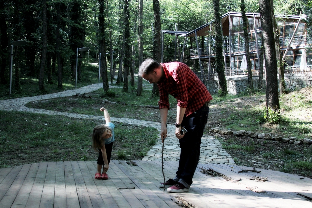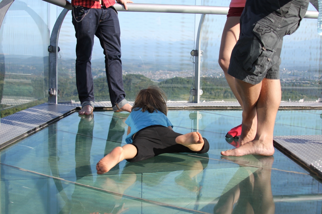 Sunąc gdzieś w tyle za innymi zwiedzającymi dotarliśmy na szczyt parkowego wniesienia, kiedy nie było tam już nikogo poza przysypiającym strażnikiem. Zdjęliśmy buty i na bosaka wbiegliśmy na oszklony taras. Dokładnie tak – oszklony, całkowicie oszklony, łącznie z podłogą. Pod nami przepaść, przed nami rozległy widok na okolice Kutaisi. Bardzo przyjemne wrażenie. Specyficznego uroku dodawała miejscu cisza i pustka dookoła – nowiutki taras bez gości, biała dizajnerska kawiarnia zamknięta na trzy spusty.