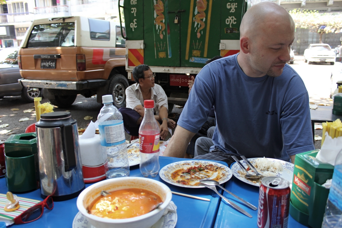 Wyszliśmy na śniadanie. W dzielnicy oddalonej od turystycznych atrakcji byliśmy jedynymi farangami (biali). Jeden łysy, drugi w dredach, wszyscy bladzi, a do tego małe białe dziecko. Uśmiechy i szepty niemal przyklejały się do nas. Rangun okazał typowym azjatyckim miastem. Zapracowanym, raczej brudnym, raczej biednym, średnio hałaśliwym. Po śniadaniu dwójka z nas miała wyruszyć na dworzec autobusowy zakupić bilety nad Inle, a pozostali ruszyli w miasto. Upał był straszny. Zapakowaliśmy Marysię do wózka i przed siebie, skok, podskok, przeskok, góra, dół… Marysia nie miała nic przeciwko warunkom panującym na tzn. chodniku, ale wózek miał. Nie zdążyliśmy dojechać do kolejnej przecznicy, gdy nagle trach! No i było po wózku. Rama pękła jak gałązka. To apropos decyzji „wózek, czy nosidło?„. Warto dobrze rozważyć ten temat. A od tamtego czasu w kwestii warunków drogowych na pewno nic się nie zmieniło.