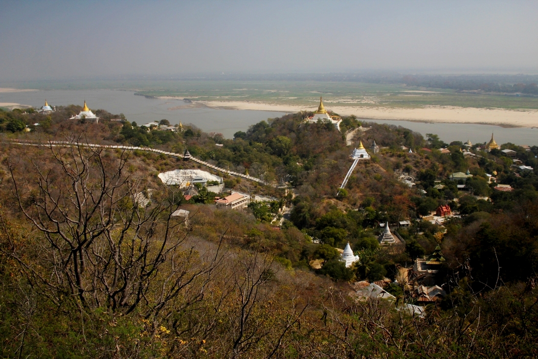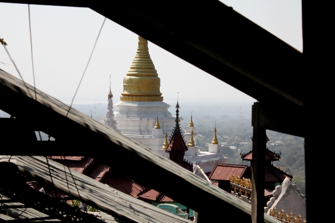 Tak na prawdę zwiedzanie zaczęliśmy popołudniem dnia poprzedniego. Pojechaliśmy w okolice Mandalay Hill. Znajduje się tam wiele pagód. Kuthodow Pagoda to wyjątkowe miejsce, w którym znajduje się 729 białych stup. Stupowe pole robi cudowne wrażenie. To tutaj Mary została „napadnięta” przez grupę birmanek i nabiła sobie solidnego guza zamachując się wielkim bijakiem, którym chciała uderzyć w dzwon. Przy zamachnięciu się bijak przeważył w jej małych rękach i wylądował… na głowie. Tuż przed zachodem słońca wdrapaliśmy się na samo wzgórze. Warto to zrobić o tej właśnie porze. Wbrew obawom, nie zastaliśmy niemal żadnych turystów. Pamiętajcie jednak, by dać sobie czas na dojście na szczyt – trzeba zmierzyć się z wieloma schodami. Ze wzgórza rozpościera się cudowny widok na okolicę. Rozsiedliśmy się, by podelektować się okolicznościami przyrody. Marysia zaś znalazła bandę dzieciaków do zabawy. Pobiegła do ich rodzin, bo koniecznie chcieli ją przedstawić rodzicom. Nim się spostrzegliśmy wróciła z buzią wymalowaną thanakha i zestawem nowych świecących spinek we włosach.