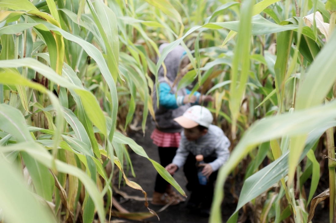 Wycieczkę zaczęliśmy od pola kukurydzy. Jak dla mnie reszta była mniej istotna. Ale ja tu nie wiele mam do gadania… Kukurydza wyrosła solidnie. Była wyższa od najwyższego z nas. Błądziliśmy w labiryncie, szukając wąskich, wydeptanych ścieżek, które doprowadzą nas do wyjścia. Nie było to łatwe, ślepych ścieżek było sporo, liście kukurydzy smagały nas po twarzach, a ich szczyty przysłaniały widok. Było sporo bieganiny i niezła zabawa. Kukurydza miała jeszcze jedną zaletę – osłaniała przed wiatrem. Było cieplutko.