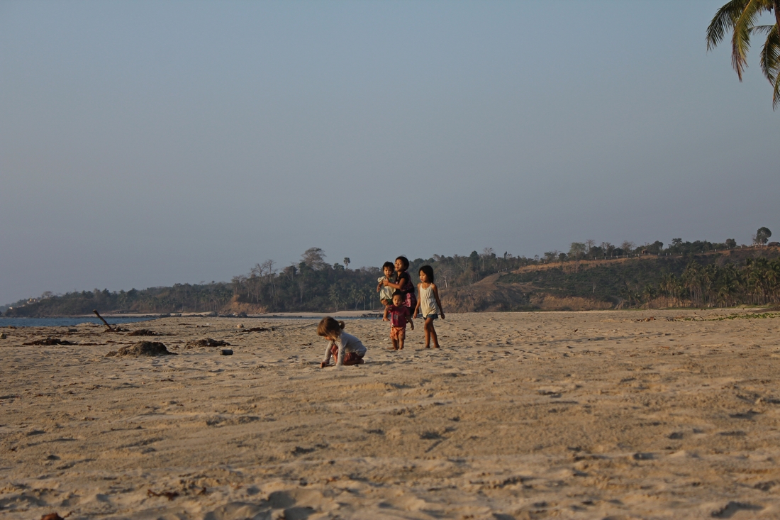 Plaża była opustoszała. Czasami ktoś przejechał na motorze. Żywego ducha dookoła. Kopanie szybko się nudziło i wtedy szliśmy na poszukiwania. W stronę kurortów nas nie ciągnęło, ale idąc w przeciwnym kierunku odkryliśmy cudowny zakątek, ukryty za małym świątynnym wzgórzem na plaży. Stały tam dwie parasolki z liści palmowych i stoliczek. Poszliśmy w ich kierunku. Tuż obok znajdował się mały rodzinny sklepik, serwujący również proste posiłki – zazwyczaj zupę i smażony ryż z tym, co było na stanie. Do tego słodziutkie świeże kokosy. Mama pichciła, tata rozłupywał kokosy, a dookoła biegała chmara dzieciaków w różnym wieku. Raj na ziemi. Objadaliśmy się tym prostym jedzeniem po uszy. Podobnie Marysia. Miała tutaj wyjątkowy apetyt. Hasło „ciem ryziu” towarzyszyło nam od pobudki. Nosiliśmy ze sobą woreczki, by chować do nich niedojedzony ryż – było pewne, że prze snem zechce coś przekąsić. Mary kochała to miejsce. Piasek, morze, umorusane dzieciaki, kopanie dziur i zalewanie ich wodą. Język nie był przeszkodą. Już po jednym dniu zaczęła używać birmańskich słówek. Szybko odkryła jak wołać dzieci, by zwróciły na nią uwagę. Było to całkiem niesamowite doświadczenie – mówiła słowami, których my nie znaliśmy, ale inni je rozumieli. Każdego dnia biegali razem, aż słońce zaszło. Z wielkim krzykiem wsadzaliśmy Mary do nosidła, by wrócić do domu. A zaprzyjaźniona rodzinka zamykała kram i pakowała się w komplecie na swój motorek. Jeszcze tylko machaliśmy sobie ręką i do zobaczenia, do jutra!