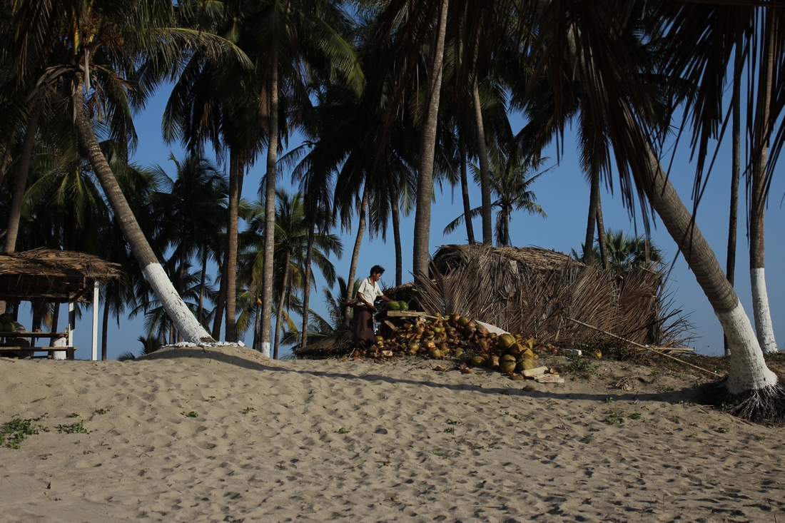 Znaleźliśmy nowiutkie bungalowy. A tak po prawdzie, to one znalazły nas. Nie były na samej plaży, za ścianą trwała budowa kolejnych, wejście do domu pod górkę, do najbliższego sklepiku 10 minut rowerem, żadnych knajp w promieniu wzroku, a do snu kołysał nas odgłos generatorów prądu (to zresztą odgłos, który zawsze towarzyszy w Birmie, w pewnym momencie przestaje się go słyszeć). Ale nic nie było problemem. Było pięknie. Po zwleczeniu się z wielkiego łóżka siadaliśmy na tarasie, gdzie czekało pachnące bananowe śniadanie.