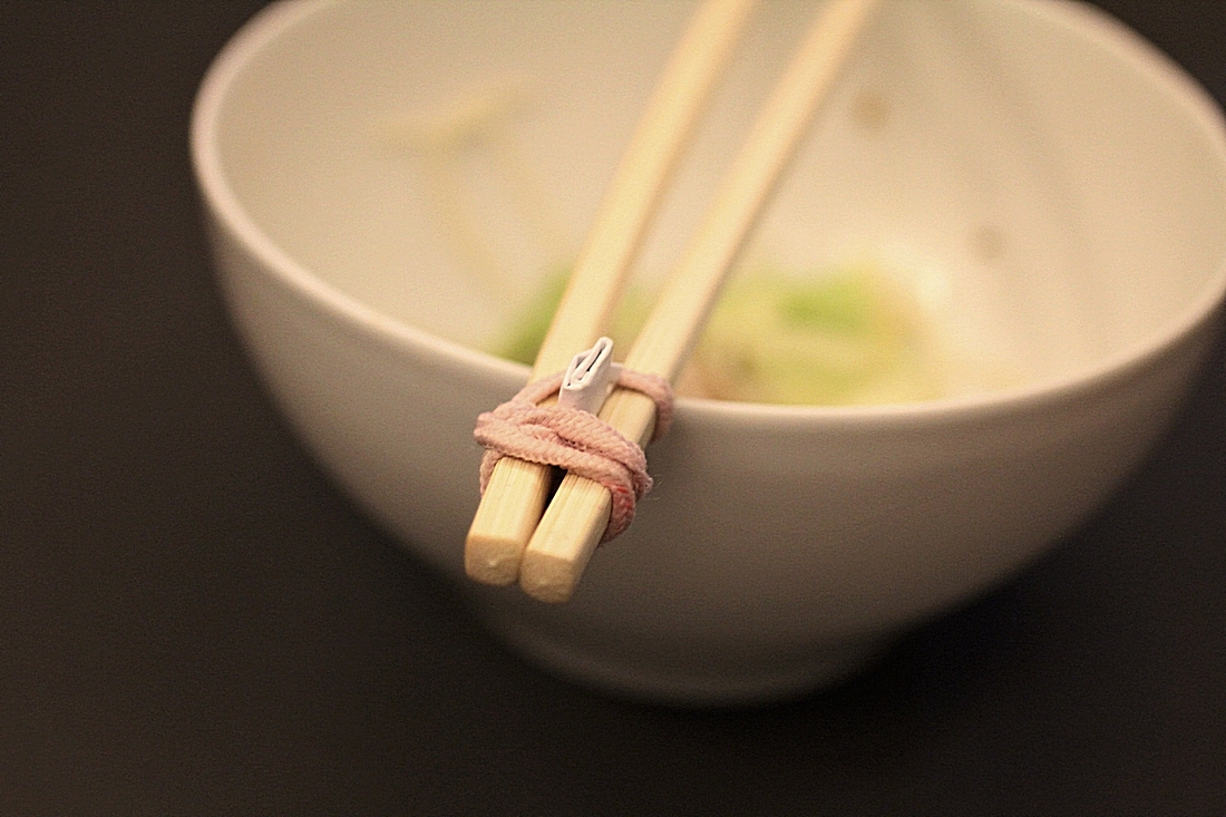 Na końcówkach spinamy pałeczki gumką, między jedną a drugą wpychając kawałek zrolowanego papieru. Dzięki gumce pałeczki pozostaną połączone i nie wypadną z dłoni dziecka. Dzięki papierkowi pozostaną rozwarte niczym pęseta, którą wystarczy zacisnąć, by złapać kęs jedzenia. Można je trzymać w dowolny sposób i na dowolnej wysokości. Jak komu wygodniej. No i zaczynamy kolację.