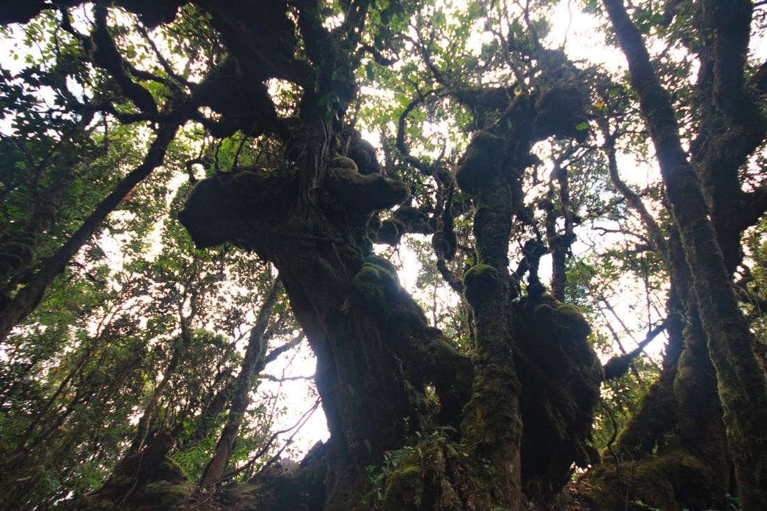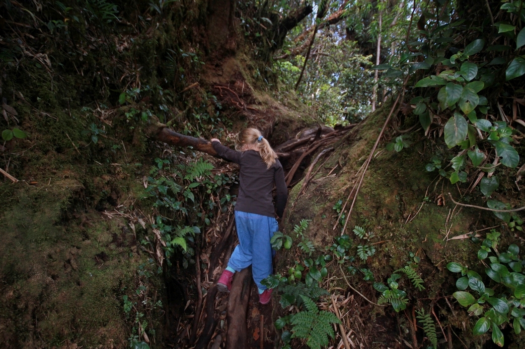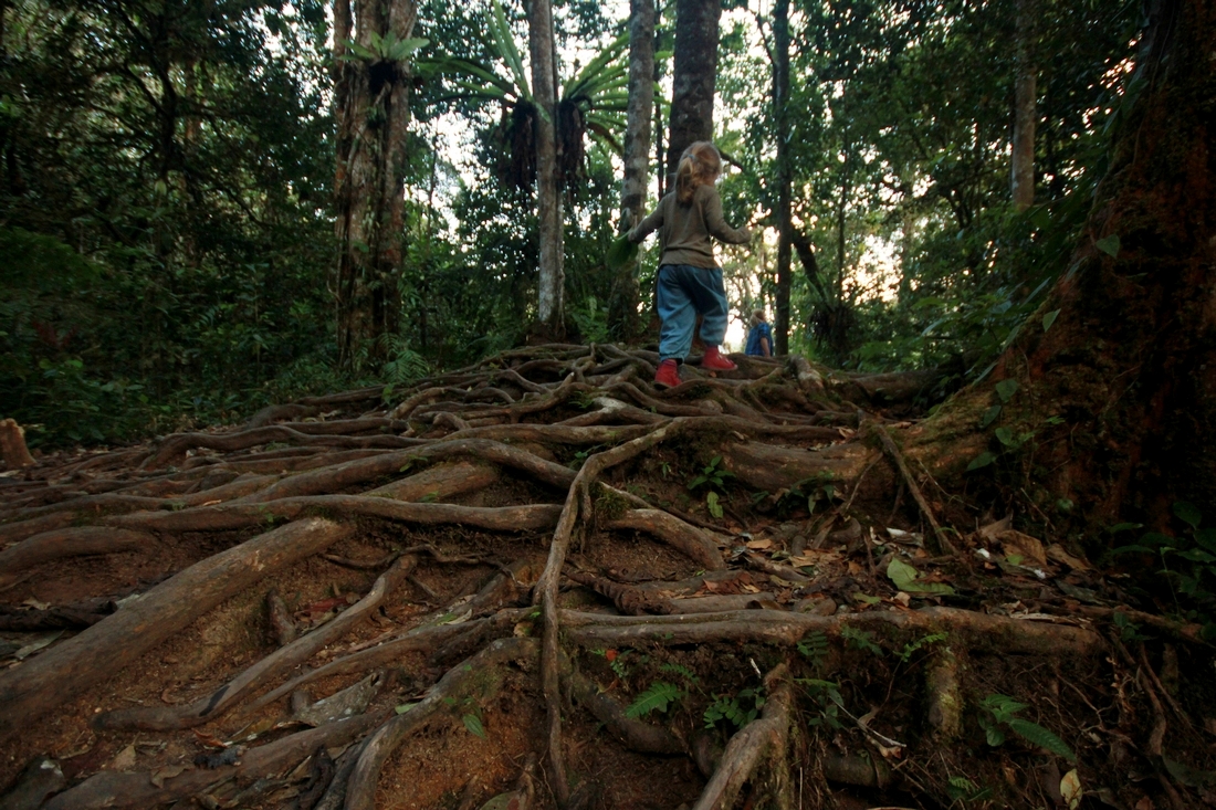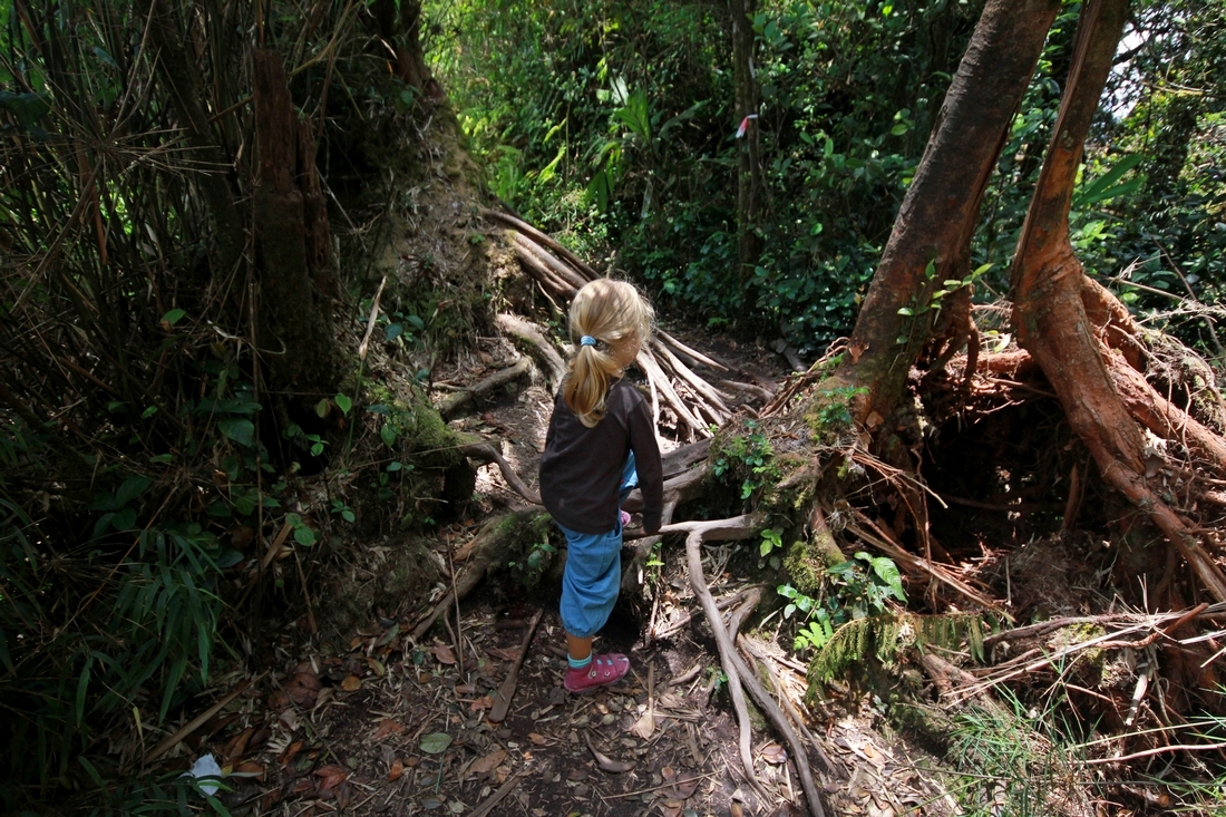 Jeszcze bardziej spodobała się Marysi wycieczka do mossy forest. Trasa znajduje się jakieś 15 km od Tanah Rata. Podjechaliśmy skuterem. Asfaltowa droga prowadzi niemal na szczyt góry, pośród zielonych plantacji herbaty. Bardzo przyjemna wycieczka. Pierwsza część mossy forest jest nadzwyczaj cywilizowana. Właściwie czuliśmy się jak w amerykańskim parku narodowym. Parking pod samą trasą. Dookoła wzgórz labirynt drewnianych tarasów i pomostów, z miejscami na przystanek i punktami widokowymi. Nawet babcię można zabrać na taki trekking. Dla Marysi zaczęło wiać nudą, bo co to za wyzwanie. Co gorsza wszędzie schody, a tych ona nie znosi. Jednak za drewnianymi pomostami zaczął się prawdziwy mossy forest. Fantazyjnie poskręcane drzewa, obrośnięte mchem i roślinnością. Wyglądały jak niesamowite stwory. aż ciemno od ich gęstości. Nie wiadomo czy to pień, czy gałęzie, czy to jeszcze to drzewo, czy już tamto, czy to roślina, czy może jakieś zwierzę. Przedzieraliśmy się przez korzenie sięgające Marysi po same pachy, wpadaliśmy w dziury, ślizgaliśmy się na liściach. Mary wszędzie chciała wdrapywać się sama, a my mieliśmy wrażenie, że sił jej tylko przybywa. I nawet do głowy jej nie przyszło, by stanąć nam na drodze i wyciągnąć ręce w górę…