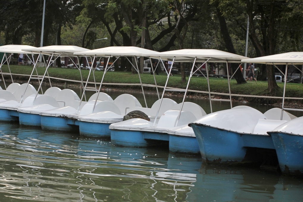 Central Park Bangkoku. Klasyk wydania. Lubiliśmy go z tego samego powodu, dla którego lubi się Central Park właśnie. Zbudowany ręką ludzką kawałek wytchnienia od tego, co zbudowała inna ręka ludzka. Równolegle do parkowych ścieżek, biegną betonowe wiadukty Sky Traina. Pod jeziorkiem dudni metro. Ponad zielonymi konarami w niebo wzbijają się wieżowce i biurowce. Ich pracownicy, po zrzuceniu z siebie granatowych mundurków, przychodzą tu na jogę, na ryby, na ławkę, na chwilę wytchnienia. I choć trudno tu mówić o dzikości natury, każdy udaje, że właśnie ją znalazł. Nawet żółwie, ptaki, ryby i zachwycające warany, które biegają wszędzie samopas. Często pracowałam w okolicy, a wtedy Marcin pakował swoje biuro, Marysia brała zabawki i spędzali czas w Lumpini, czekając na mój powrót. A dzieci nie mają prawa się tu nudzić. Są place zabaw, siłownie, no i oczywiście jeziorko. A na nim… wodne rowery w kształcie łabędzia.
