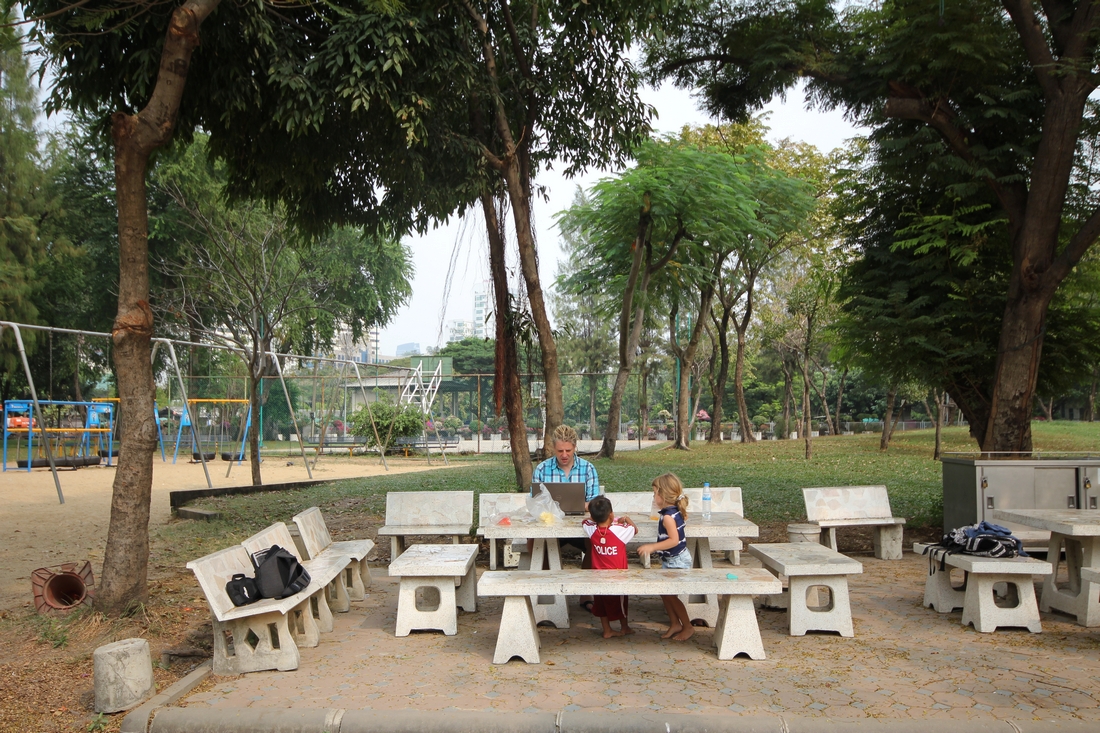 No i park, który darzymy szczególnym sentymentem — Chatuchak. Najbliżej naszego domu, zawsze gdzieś po drodze, obok sławnego już weekendowego bazaru. Największy z tych, które odwiedzaliśmy, choć mam wrażenie, że tu najtrudniej uciec od amoku miasta. Plac zabaw nieco już trąci myszką, ale zdaje się tylko dorośli to zauważają. Są jeziorka, wokół nich kręcą się wodne żółwie. Idealne miejsce na drzemkę po męczących zakupach na bazarze.