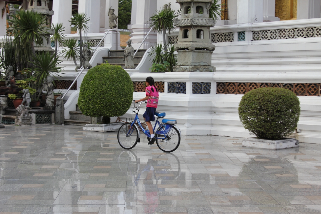 To fakt. Bangkok nie jest przyjazny rowerzystom. Jazda ulicą jest mało przyjemna i to nie z powodu dziur w asfalcie. Chodzi o natężenie ruchu. Sznurek samochodów, dużych samochodów, szerokich samochodów. Dziesiątki rozklekotanych autobusów. Setki motorów, próbujących przechytrzyć innych uczestników ruchu. Do tego tuk-tuki, ryksze, jeżdżące budy z jedzeniem i inne azjatyckie wynalazki. Rzadko się zdarza, że pojazdy te pędzą. Zazwyczaj stoją w gigantycznym korku i suną ociężale. Szybciej niż potrącenie, grozi nam zatrucie spalinami. Zaś jazda chodnikiem praktycznie nie wchodzi w grę. Chodniki w Azji nie służą nawet pieszym. Bo chodnik to przede wszystkim restauracja. Czasem bywa bazarem, może być punktem usługowym, ewentualnie parkingiem. Jednym słowem, na chodniku nie ma miejsca dla rowerów. A nawet jak się znajdzie, to dziury, schody i krawężniki skutecznie odstraszają.