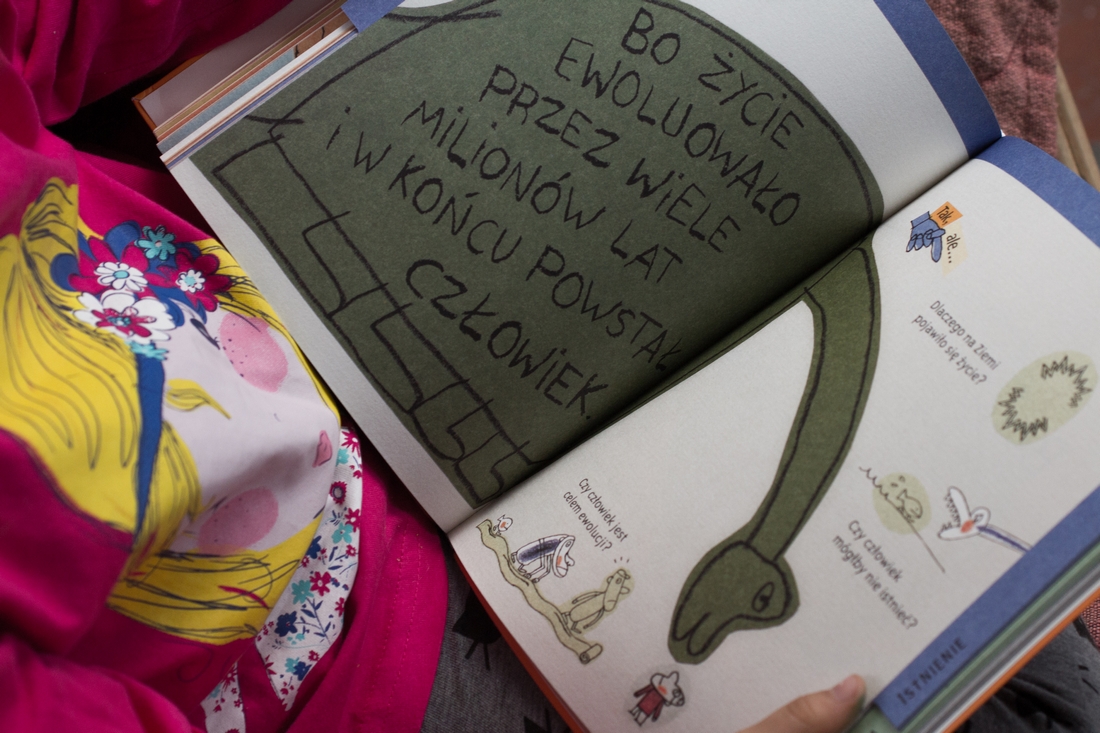 Wiecie co podoba mi się w tej książce? Że można do niej wracać po jakimś czasie, a za każdym razem będzie dla nas odkryciem i przyniesie nam nowe odpowiedzi. Bo inaczej wyglądać będzie rozmowa z 5 latkiem, inaczej z 7 latkiem, inaczej z 9 latkiem. Na pewno z każdym z nich można ją „poczytać”, choć etykieta głosi, że to książka 7+.