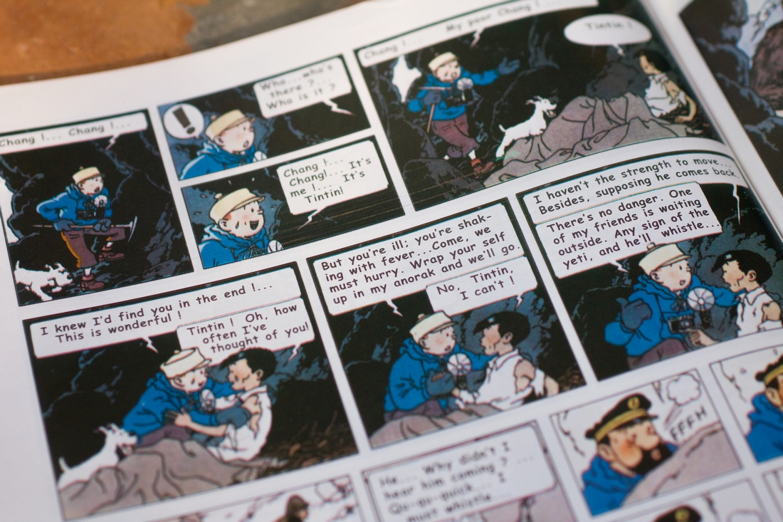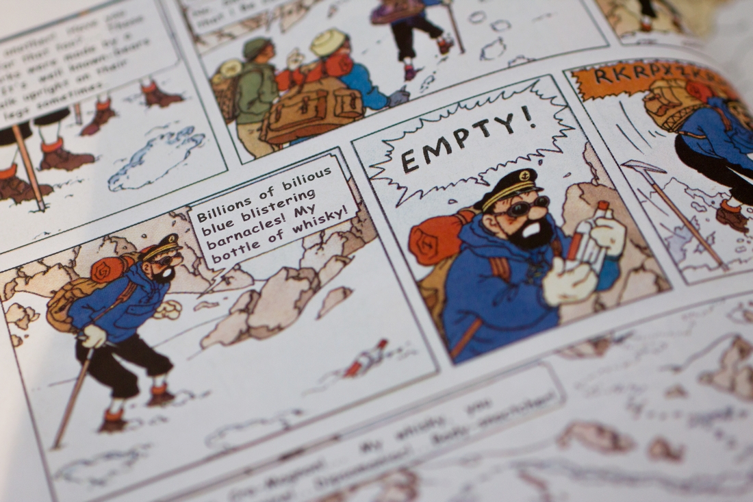 Marysi spodobał się duży format i kolory. Najważniejsze jednak, że spodobali jej się bohaterowie — zabawny TinTin ze sterczącą grzywą no i biały foksterier Snowy. W Polskiej wersji nazywany jest Milusiem, jednak dla nas, z powodu oczywistych skojarzeń oraz w ramach nauki angielskiego, został oczywiście Śnieżkiem. Do Kapitana, w polskiej wersji zwanego Kapitanem Baryłką, przekonywała się Marysia nieco dłużej. W końcu polubiła go, zdaje się za jego słabość do… whisky :). Chyba trochę zrozumiała, na czym polega stan upojenia alkoholowego — śpiewa się piosenki, szybko chodzi po górach i widzi gwiazdy dookoła. Jeśli ktoś nie chce dziecka wtajemniczać w te tematy, TinTina odradzamy.