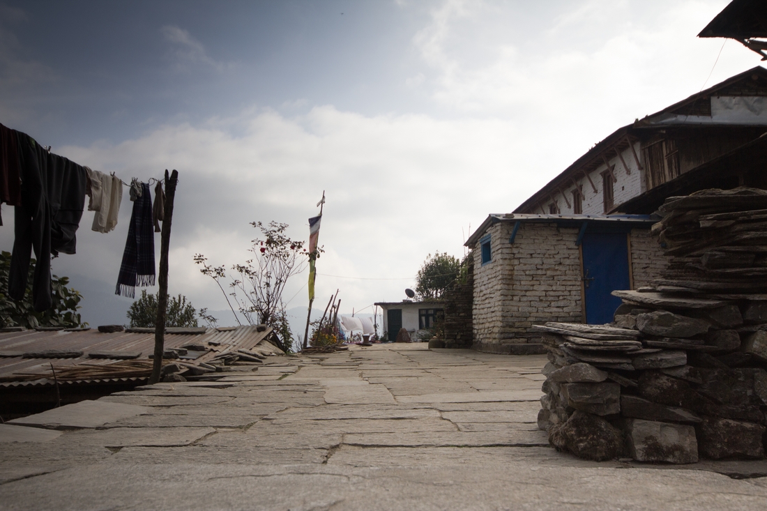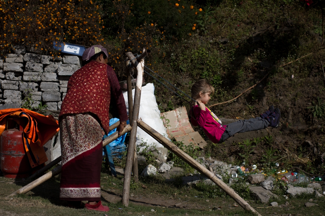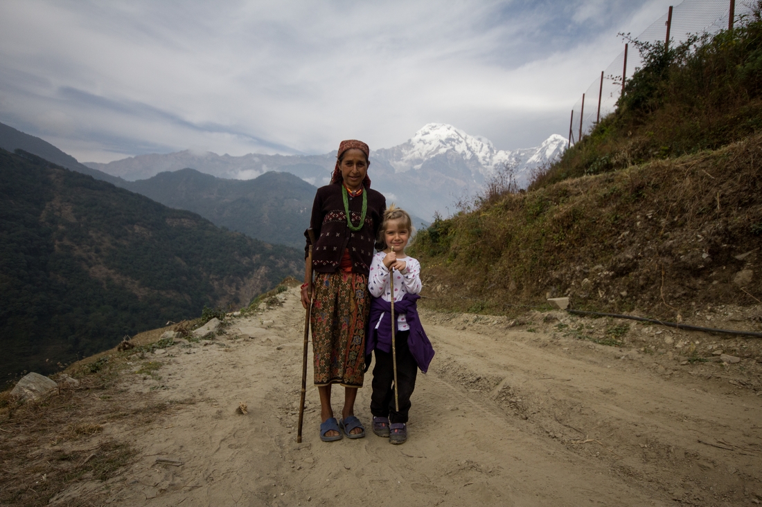 Kolejne wioski mijamy niemal co chwila, niemal jedna za drugą. Praktycznie każda z nich ma do zaoferowania miejsca noclegowe i posiłek. Można więc iść dopóki sił wystarcza, a ciemność nie przeszkadza. Korzystaliśmy z tego, bo Marysia z biegiem dnia zyskiwała na siłach, a po popołudniowej zupie niemal musieliśmy ją gonić. Mogła wskakiwać po kamieniach, gadając jednocześnie i poganiając ociągających się. Dodatkowo na trasie wiele się działo. Po pierwsze dzieciaki. Ich droga do szkoły jest zupełnie niesamowita, a jednocześnie długa i męcząca. Niejednokrotnie towarzyszyły nam przez kilka kilometrów, zagadując i zaczepiając. My byliśmy dla nich atrakcją, ale Marysię i tak bardziej pociągała… trzoda. Najpierw kozy — można do nich podejść, pogłaskać i nakarmić. Potem stada osłów, wnoszących do najwyższych wiosek wszelkie nawet cegły. Jej respekt wzbudzały bawoły i krowy. Frajdą były nawet kury i koguty. Tutejsze wioski są niezwykle urocze, nie tylko z powodu powalających widoków na najwyższe szczyty świata. Tradycyjna drewniana zabudowa, bardzo zadbane obejścia, tradycyjne metody uprawy. W jednej z z takich wiosek, w Ghandruku, zostaliśmy na dwie noce. A było jeszcze kilka, w których mieliśmy ochotę to zrobić (Tolka, Pothana).