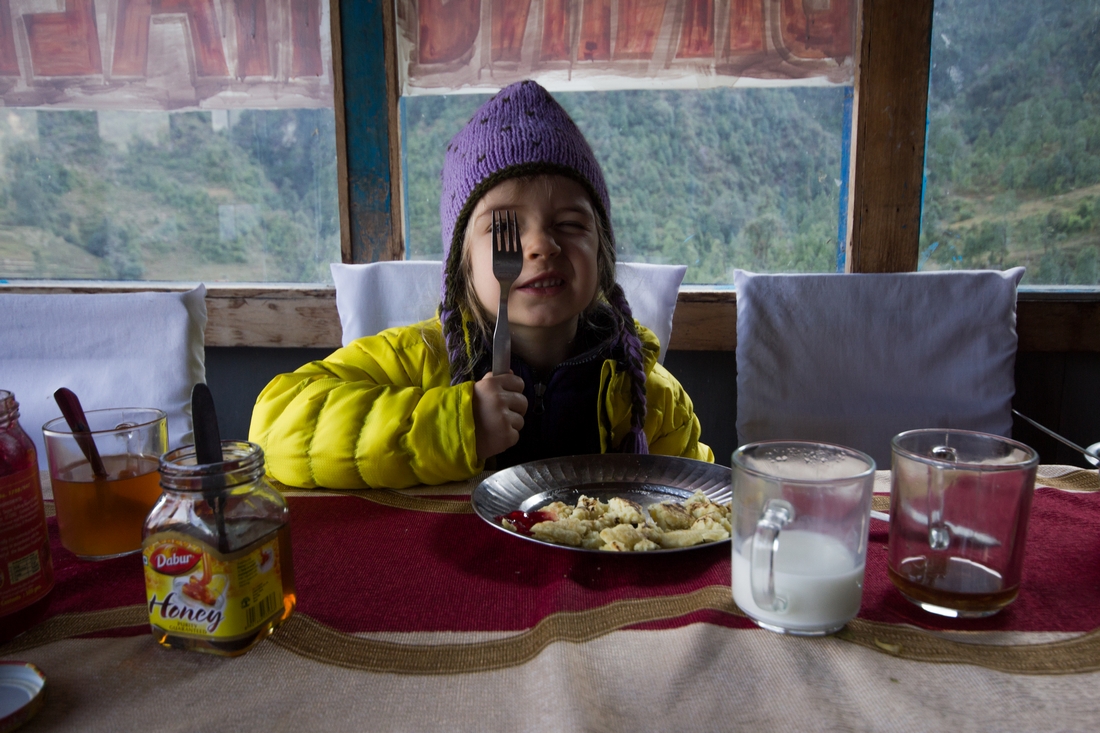 Mity krążą na temat cen jedzenia w górach. Rzeczywiście, są dwukrotnie wyższe, niż na nizinach. Jednak o czym my mówimy — dal bat 15 zł, momo 10 zł, zupa warzywna 7 zł, curry 15 zł. Solidna kolacja dla całej rodziny to koszt ok 40 zł. Szczególnie oszczędnym polecamy brać dal bat, do którego podawane są dokładki praktycznie bez ograniczeń. Dodam tylko, że wszystko super smaczne, świeże, warzywa rwane z przydomowego ogródka i podawane ze szczerym uśmiechem i wdzięcznością. Zazwyczaj praktykowane jest stołowanie się u ludzi, u których się śpi. Zwłaszcza, gdy zaoferowano nam nocleg za 100 rupii.