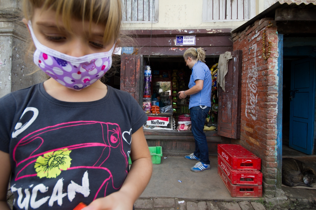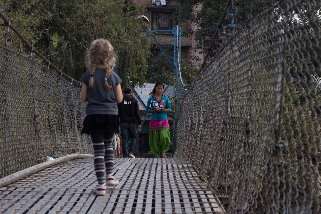 Przemykamy naszą uliczką, zagadując do lokalnych sklepikarzy. Mijamy warzywny bazar, a znajome staruszki machają do nas z daleka. By uciec z ruchliwej Kalimati Rd., skręcamy w dziurawą uliczkę sprzedawców mięsa. Tego o tu wisi na hakach nie sposób opisać, ale jest to dla nas jedna z bardziej fascynujących ulic miasta. Mijając ulicznych fryzjerów, docieramy do Bagmati – rzeki świętej, rzeki ścieku. W Azji doliny rzek to często slumsy miasta i tu jest podobnie. Idziemy wzdłuż brzegu, kupujemy garść cukierków, którymi dzielimy się z dzieciakami. Wreszcie docieramy do ulubionego mostu Marysi, który odkryłyśmy przypadkiem, błądząc po okolicy — wiszący most tylko dla pieszych.