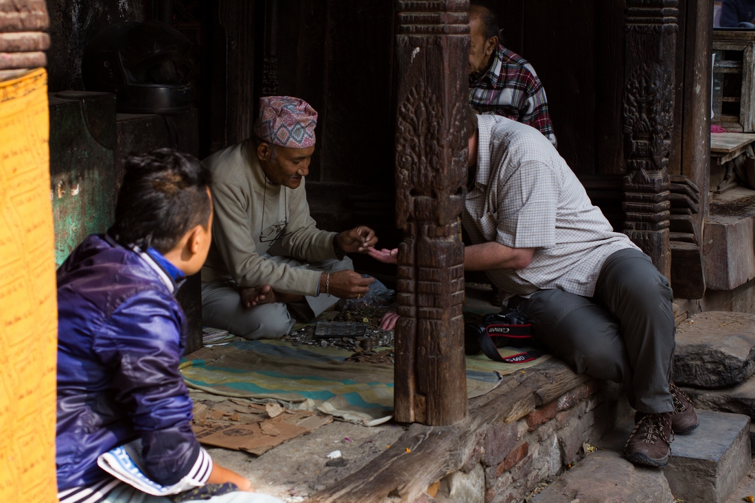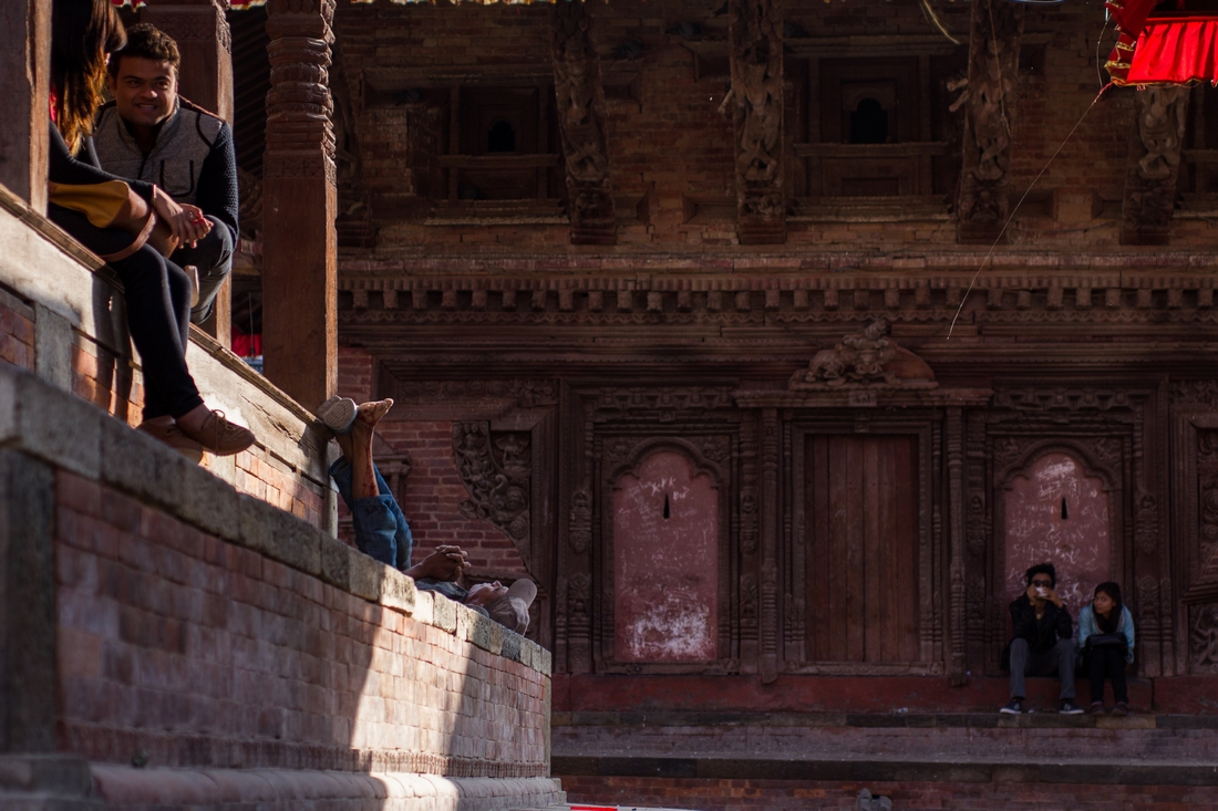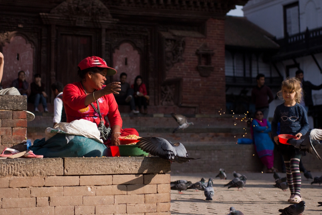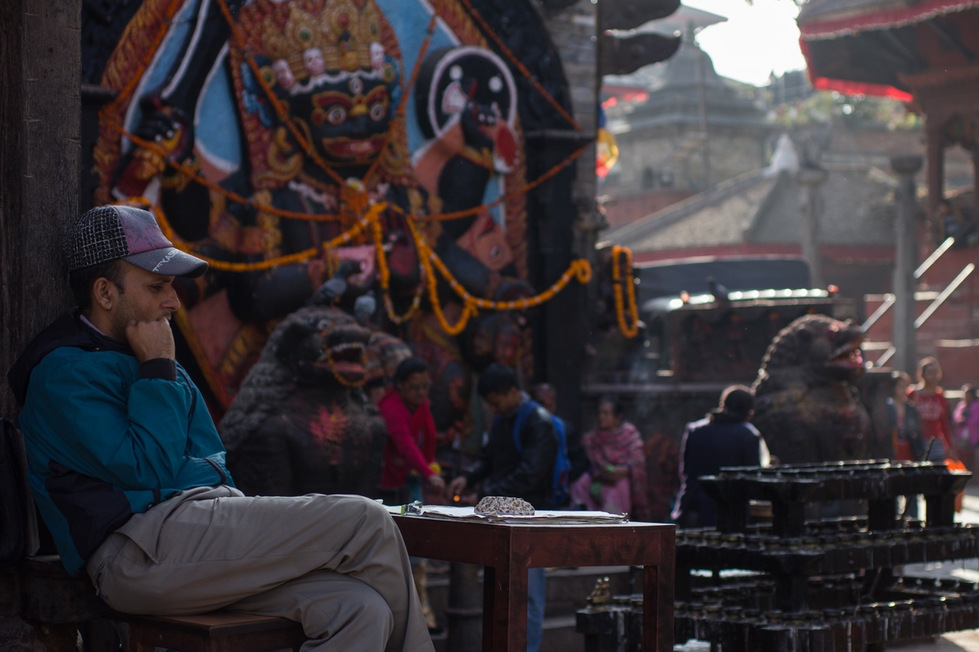 Siedząc na najwyższym stopniu świątyni, widać, jak wszystko tutaj tętni życiem. Jest w tym jakaś melodia. Schodzimy i idziemy nakarmić gołębie. Przechodząc, zerkamy na Czarnego Bhajarawę — przerażające wcielenie Boga Sziwy. Ludzie tłoczą się i zapalają kadzidełka. Podobno każdy, kto skłamie w jego obecności, natychmiast umrze. Jeśli starcza nam sił, zatłoczonymi uliczkami przedzieramy się w stronę Thamelu. Ale Thamel to już zupełnie inna bajka…