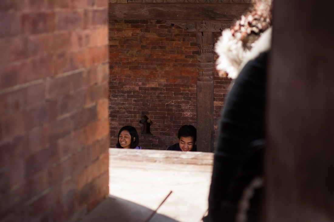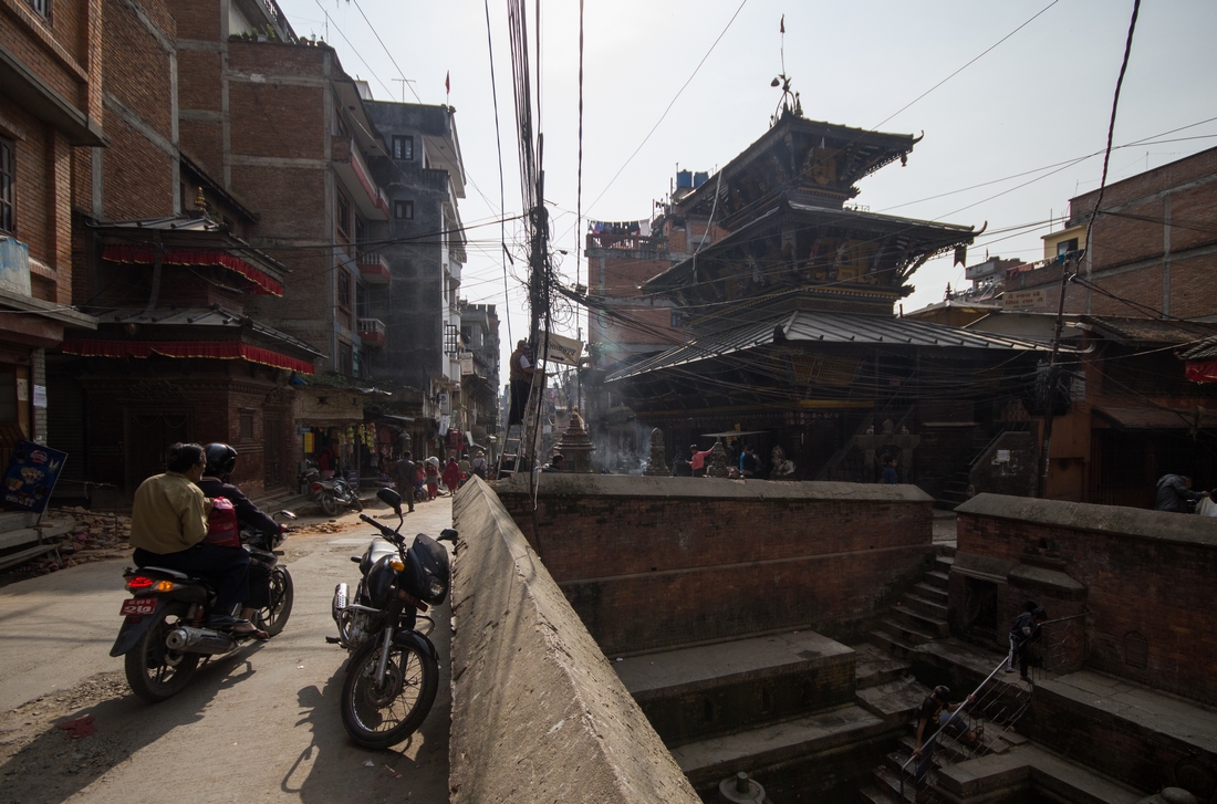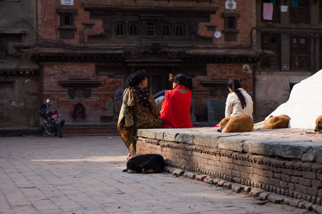 Po drugiej stronie jest już stare Katmandu. Krążymy wąskimi uliczkami, między starymi domami, hinduskimi świątyniami i buddyjskimi stupami. Robi się ciaśniej i jakby przytulniej. Mamy wrażenie, że jesteśmy gośćmi w czyimś domu. Ludzie niemal żyją na ulicy. Tu wychodzą, by po zimnej nocy, ogrzać się w promieniach słońca. Tu się myją, czeszą, piorą. Zaglądamy do podwórek, zasiadamy pod nowo odkrytymi stupami i zajadamy się świeżo usmażonymi chipsami. Wreszcie docieramy do placu Durbar.