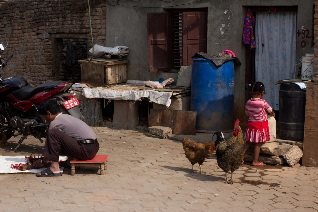 Z jednej strony wisi obdarta ze skóry koza, obok bawole głowy, po drugiej stronie bulgoczą samosy w gorącym tłuszczu. Na poboczu ktoś myje włosy, kąpie dziecko, robi pranie, zamiata obejście. I tylko krowy zdają się mieć to wszystko gdzieś. Zawsze spokojnie, leniwie, nie bacząc na cały ten zgiełk, choćby na środku ruchliwej ulicy, walą placki i szukają źdźbła trawy do skubnięcia. Tej jednak w Katmandu nie uraczysz. Zwłaszcza zielonej. Wszystko pokryte jest warstwą pyłu, w porze deszczowej błota, a w powietrzu unosi się zawiesina smogu. Na szczęście dzięki wyłączeniom prądu, często tego brudu nie widać.