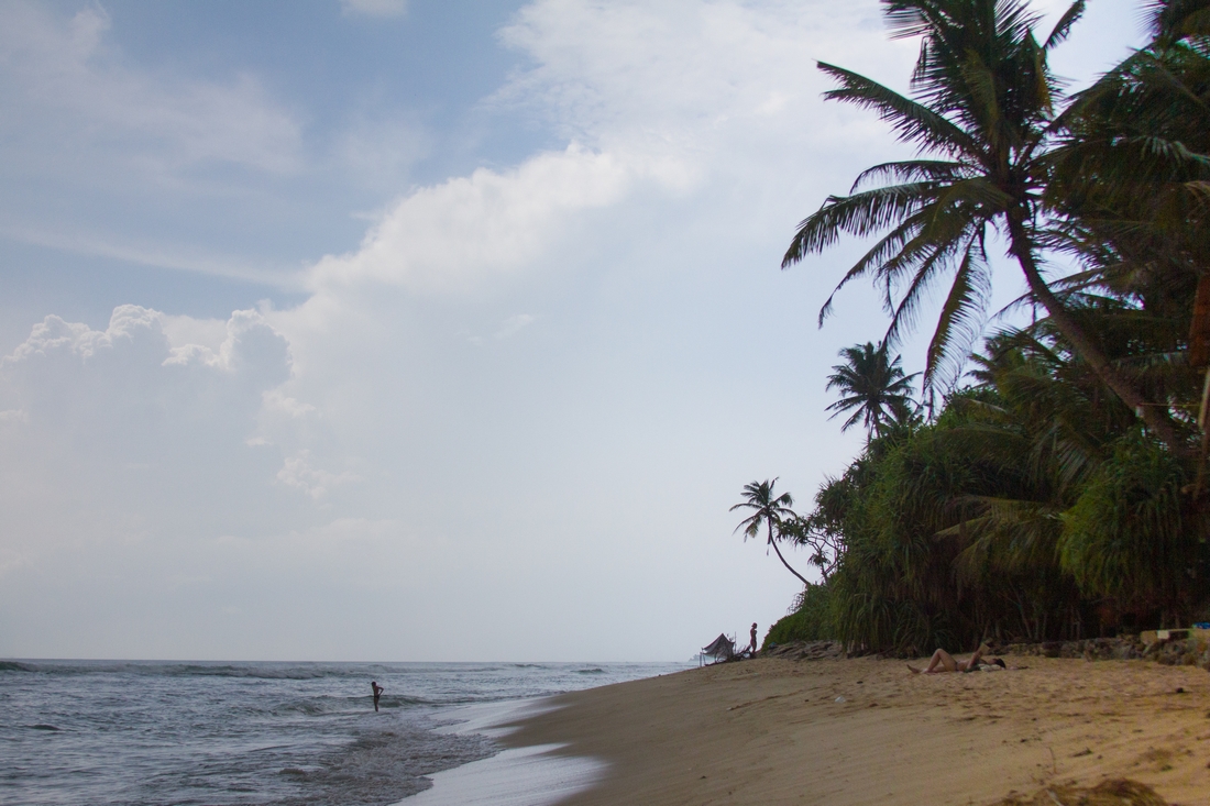 Patrz Unawatuna. Zaleta jest jedna — w pewnym miejscu plaży praktycznie nie ma fal, można położyć się na wodzie bez obaw, że woda przygniecie do dna. Wad jest sporo — przede wszystkim ludzie i śmieci. Obu jest w nadmiarze. Ale… jest ucieczka. Zamiast sadowić się na głównej plaży tuż przy Galle Road, wystarczy zagłębić się w miasteczko. Skręcić w małe uliczki, gdzie wśród palmowych gajów, znajdziecie fajne hoteliki, oddalone kilka minut od mniej popularnych, ale bardziej ustronnych i spokojniejszych plaż Mirissy.