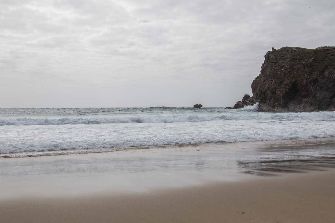 Plaża przy wiosce Mangersta to zupełnie inna bajka. By do niej dotrzeć zboczyliśmy z drogi, potem zboczyliśmy ze ścieżki, trochę dalej zboczyliśmy z pastwiska, by wreszcie znaleźć się na zielonej łące, zalec i patrzeć. Głęboko w ląd, pomiędzy strome zbocza, wrzynał się wąski pas piachu. Zupełnie, jakby ktoś rozwinął dywan, prowadzący wprost do morza. Gdzieniegdzie wydmy w postaci małych zielonych wysepek. A na końcu oszalałe wody oceanu. Bajeczne fale rozbijały się o wysokie klify. Były potężne i dzikie. Nie wzgardził by nimi żaden surfer z odległych tropikalnych plaż.