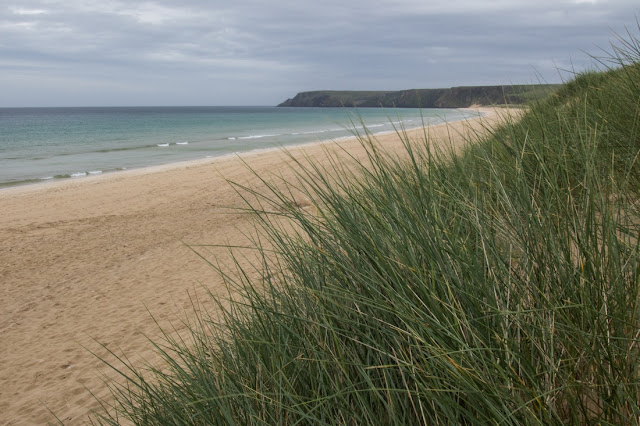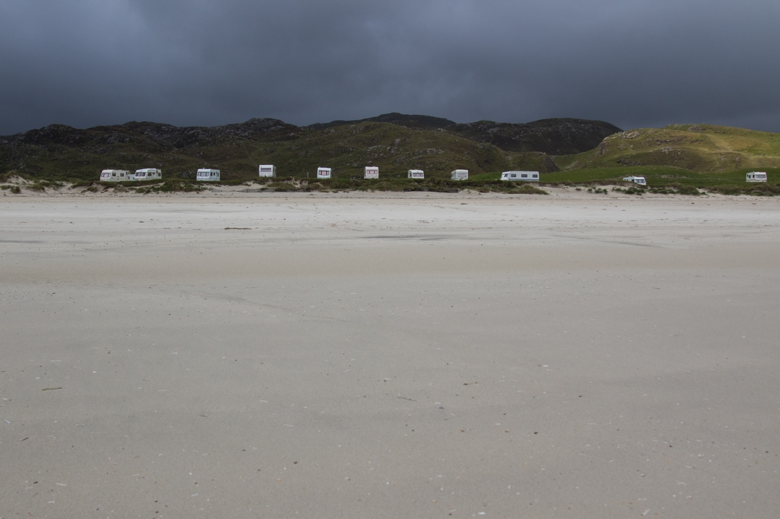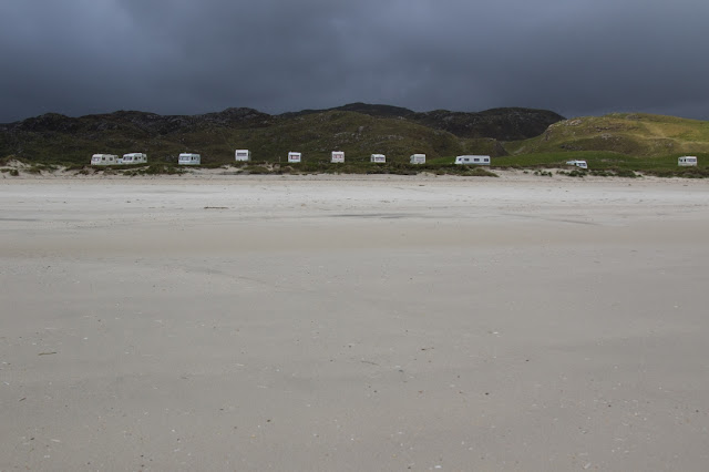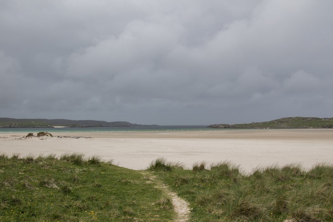 Plaża Ardroil powaliła nas swoimi rozmiarami. Dotarliśmy do niej przez zielone wąwozy, mozolnie pedałując, niemal cały czas pod górkę. Ujrzeliśmy jej białe piaski dość szybko, jednak do plaży ciągle było daleko. Przejechaliśmy jeszcze wiele kilometrów, nim dotarliśmy na miejsce. Idąc przez wydmy nie widzieliśmy nawet piachu. Idąc plażą, ledwo dostrzegaliśmy morze. Bo Ardroil jest niemal brazylijska w swym rozmachu. Wody są raczej spokojne, wkoło pustka i cisza, tylko mewy i szum delikatnych fal. Kusi, by się tutaj rozbić, ale koniecznie na dziko. Kepming niestety ukryty jest gdzieś w polu za wydmami i nie pozwala cieszyć oczu tym, co tutaj najpiękniejsze.