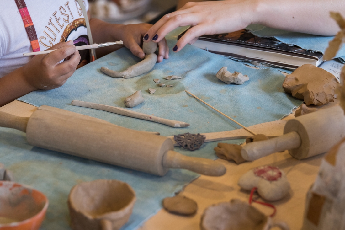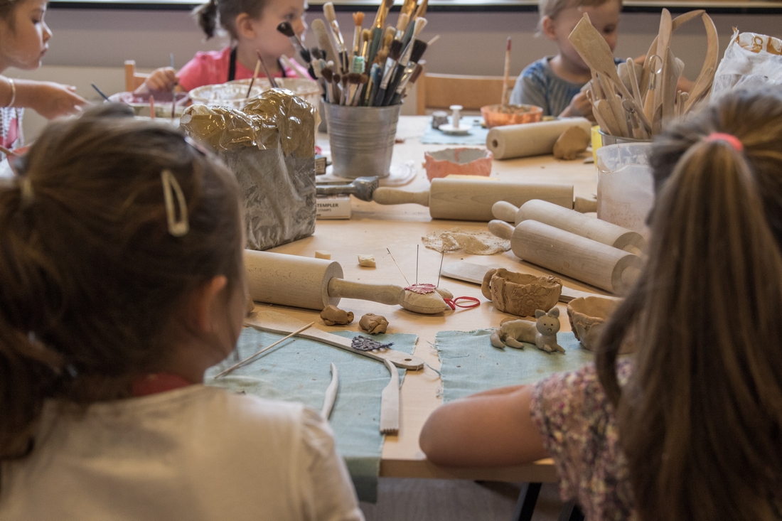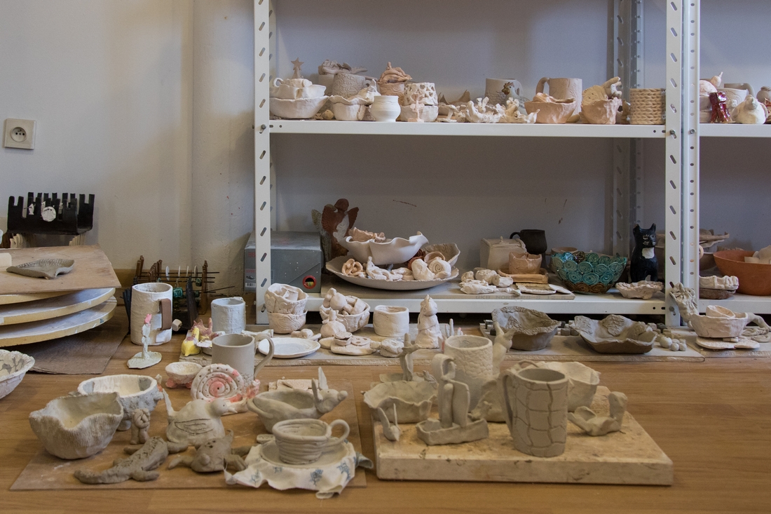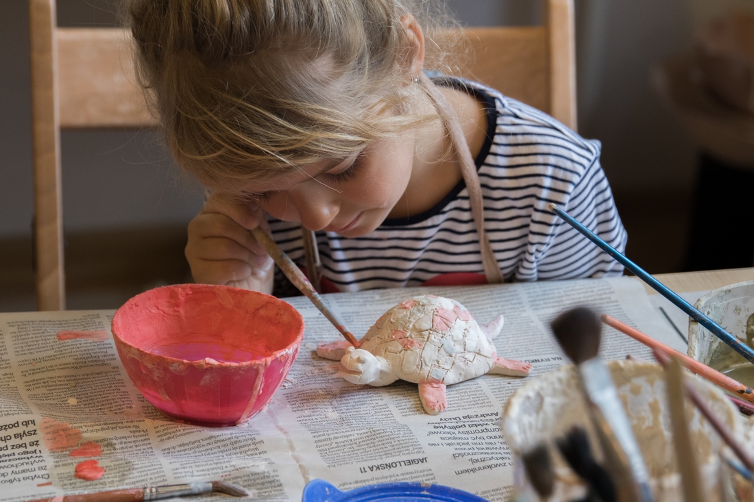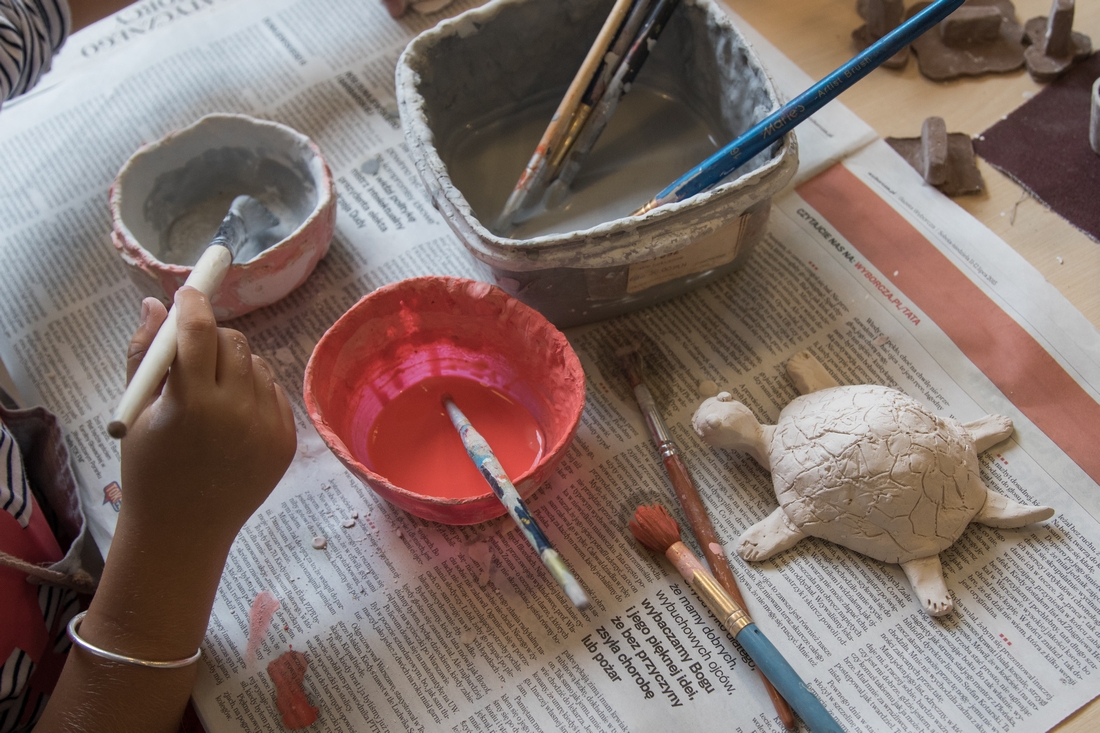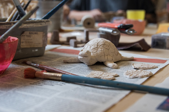 W czasie pierwszej wizyty w pracowni ugniatałyśmy glinę. Zdaniem Marysi to najlepsza część zabawy. Miękka i przyjemna glina daje się formować w najbardziej fantazyjne kształty. Gdy do tego wykorzystać koronki, pieczątki, patyki, wałki i inne przyrządy, wyczarować można cuda. Oprócz żółwia Marysia zrobiła też ceramiczne prezenty dla wszystkich babć i dziadków. Po wygniataniu i formowaniu trzeba czekać… Czekać, aż glina zostanie wypalona w specjalnym piecu. W temperaturze 900 stopni robi się twarda, choć nie jak skała. Trzeba pamiętać, że ceramiczne cuda są bardzo delikatne.