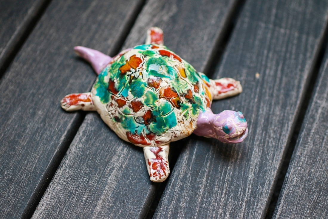 W czasie kolejnej wizyty w pracowni dodawałyśmy żółwiowi kolorów. Wcale nie taka łatwa sprawa. Szkliwo, którym pokrywa się wypaloną glinę ma to do siebie, że w czasie malowania wygląda zupełnie inaczej, niż po wypaleniu. Trzeba więc było poruszyć wyobraźnię, by nadać żółwiowi kolor, jaki sobie wymyśliłyśmy. Efekt końcowy i tak nas zaskoczył, ale nie uprzedzajmy faktów! Bo po malowaniu znowu trzeba czekać… Czekać, aż szkliwo zostanie wypalone. Nasz żółw znowu wylądował w wielkim piecu. Dopiero w czasie kolejnej wizyty w pracowni mogliśmy go zobaczyć w pełnej krasie. Czyż nie piękny?! Tylko czy to jest Mumu, Fufu, Kuku czy Tutu?