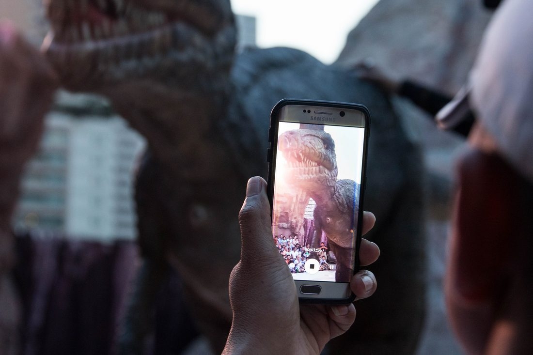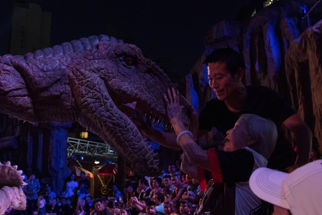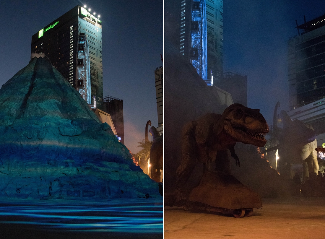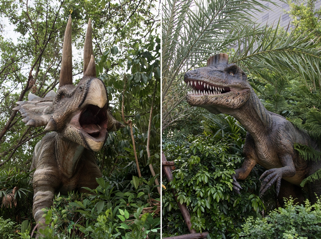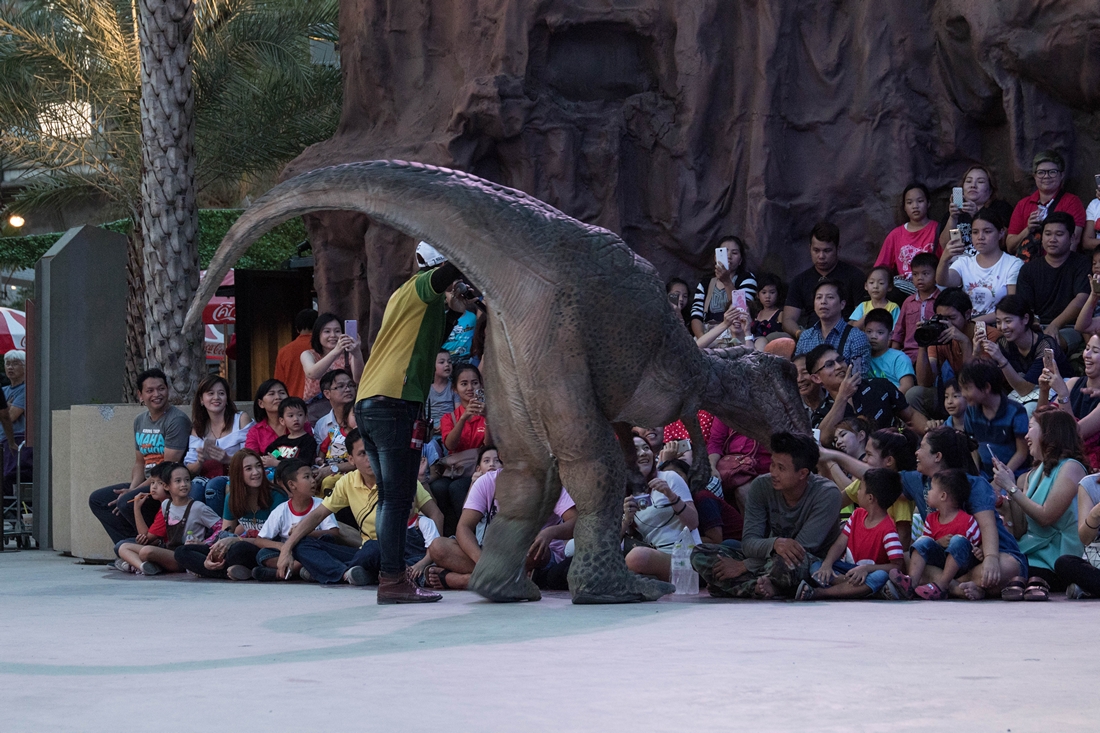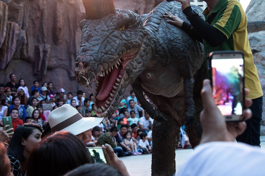 Jedną z głównych atrakcji parku jest wielkie show o wyginięciu dinozaurów. Brzmi może dramatycznie, ale jest to całkiem ciekawy interaktywny spektakl. Nie zdradzimy szczegółów na wypadek, gdyby ktoś postanowił się wybrać. W każdym razie jest wybuch wulkanu, trzaskają ognie, leje się lawa, trzęsie się ziemia (czyli ławki), zapadają ciemności i krew mrozi się z żyłach :). Ale dla rozluźnienia napięcia, na końcu dinozaury pozują do zdjęć, przybijają piątkę i zaprzyjaźniają się z dzieciakami. Spektakle odbywają się o stałych godzinach i tutaj zazwyczaj trzeba ustawić się kolejce.