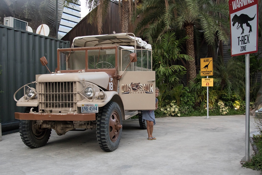 A tak naprawdę to martwiliśmy się, czy Marysia nie wystraszy się wielkich ryczących dinozaurów. Żebyśmy przypadkiem z krzykiem nie musieli wracać do domu. Kiedy jednak oznajmiła, że nie będzie płakać i dinozaurów nie zamierza się bać, dyskusje się zakończyły. Po wybraniu odpowiedniej pory — wieczorem, kiedy robi się chłodniej, oraz odpowiedniego dnia -— gdy wszyscy są w pracy i nikomu nie chce się jeździć z dziećmi do centrum, ruszyliśmy do Dinosaur Planet.